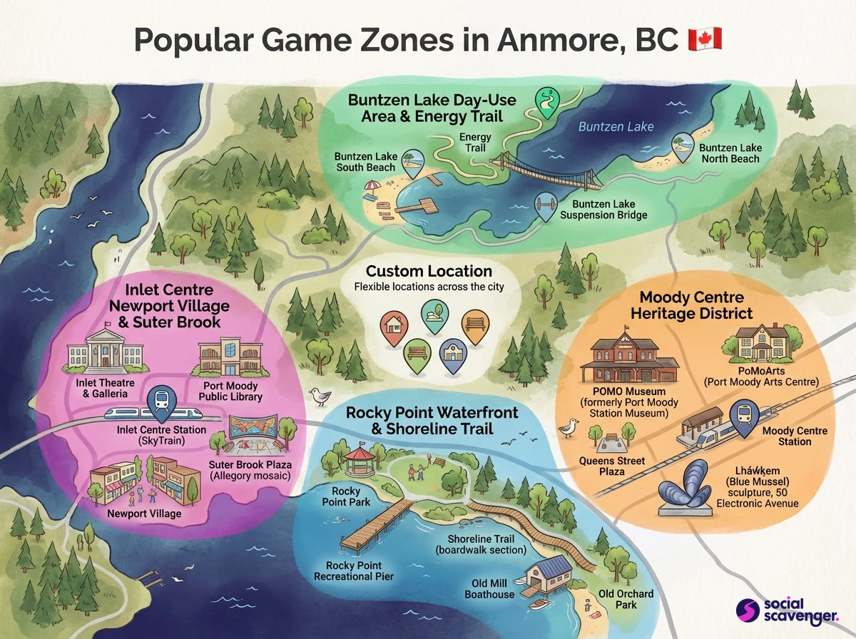 Social Scavenger games in Anmore typically take advantage of the area's natural beauty and open spaces. While specific locations are tailored to your needs, popular options include local parks and other accessible outdoor areas. Our team works with you to select the best setting that suits your group's preferences and goals.