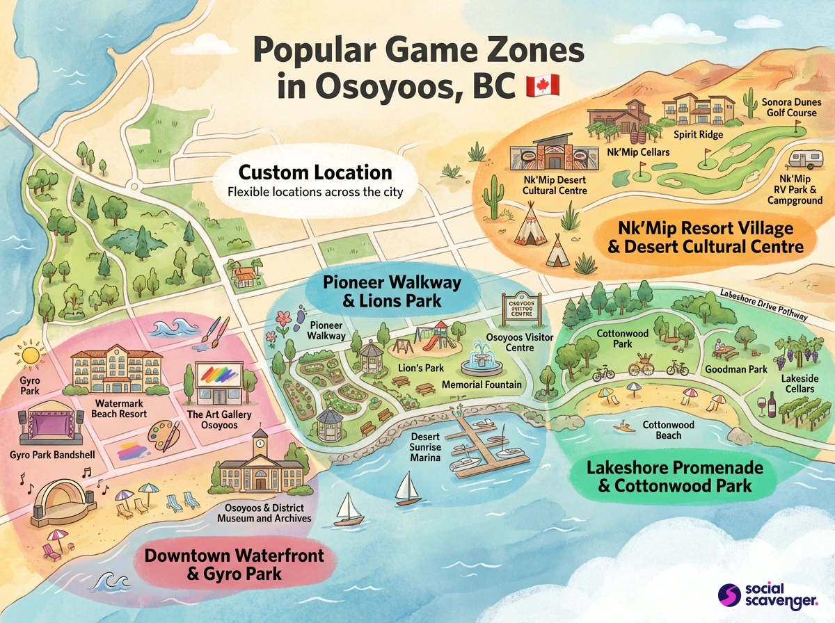Social Scavenger games in Osoyoos are typically held in various public spaces and scenic areas around the city. We design experiences that take advantage of the city's charming landscapes and community-friendly areas, ensuring an engaging team-building experience.