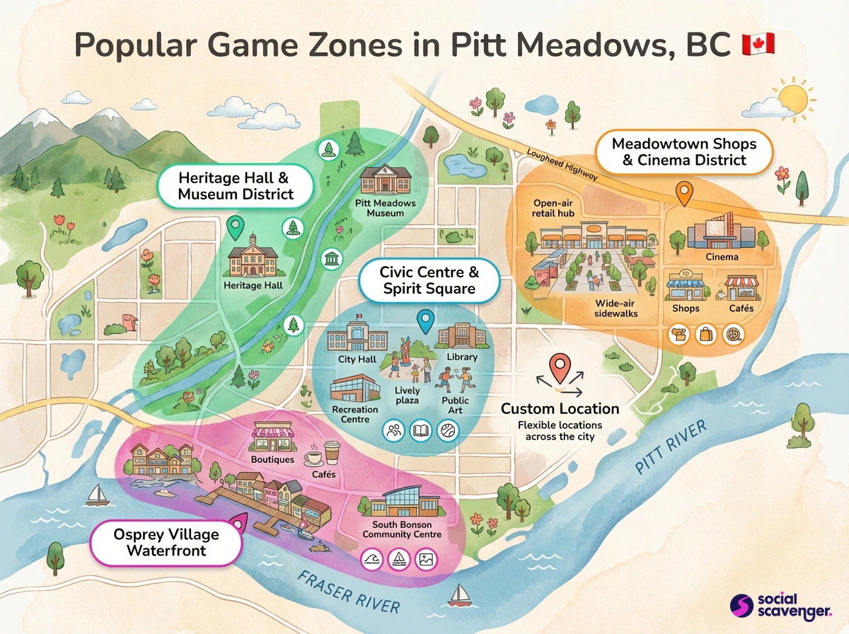 Social Scavenger games in Pitt Meadows are designed to be flexible and can take place in various locations, including urban areas and public parks. We focus on selecting areas that highlight the natural beauty and charm of the city, providing an engaging backdrop for your team-building experience.