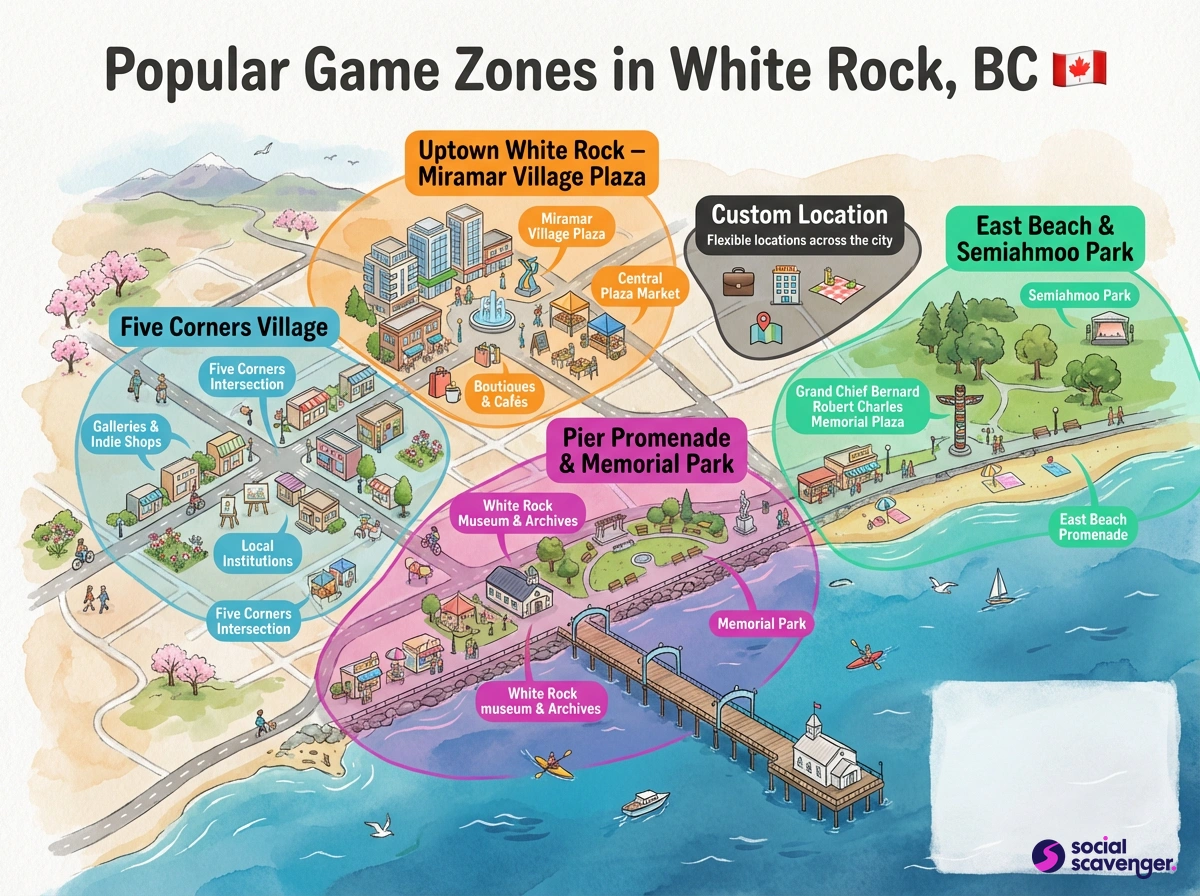 Social Scavenger games in White Rock typically occur in scenic and accessible areas such as near the waterfront or in local parks. These locations offer a vibrant backdrop that enhances the team-building experience.