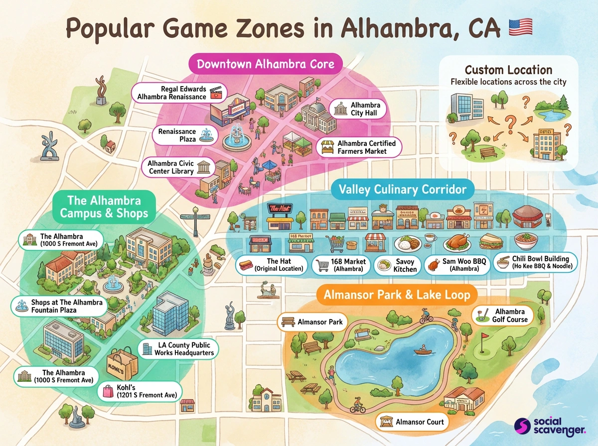 Social Scavenger games in Alhambra can be held in a variety of settings, including the city's charming downtown area and public parks. These locations offer a vibrant backdrop for engaging team-building activities, while also allowing flexibility to suit your group's needs.