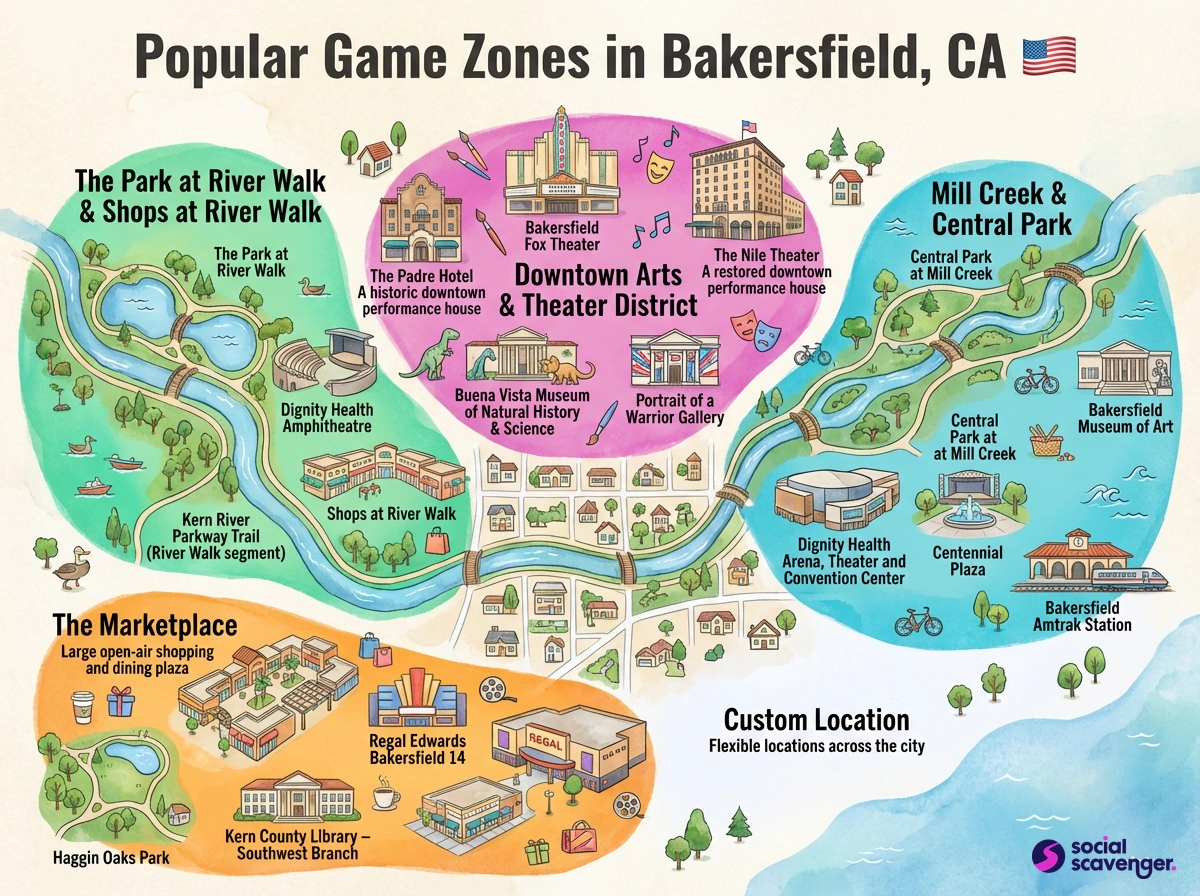 Social Scavenger games are designed to be flexible and can be held in various locations throughout Bakersfield, such as downtown areas, parks, and other public spaces. We work with you to choose locations that best suit your team's goals and preferences.