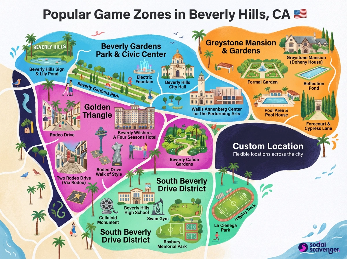 Social Scavenger games in Beverly Hills typically happen in iconic areas like the bustling streets near Rodeo Drive, the scenic Beverly Gardens Park, and other accessible public spaces. The exact location can be tailored to your team's needs and the specific goals of the event.