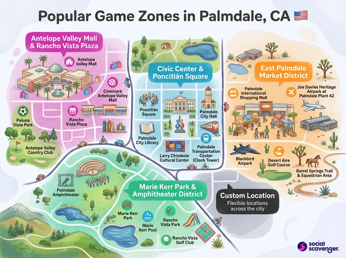 Social Scavenger games in Palmdale are adaptable and can be hosted in various locations such as local parks, downtown areas, or even within your office space. We work with you to choose venues that best fit your team's needs and logistical preferences.