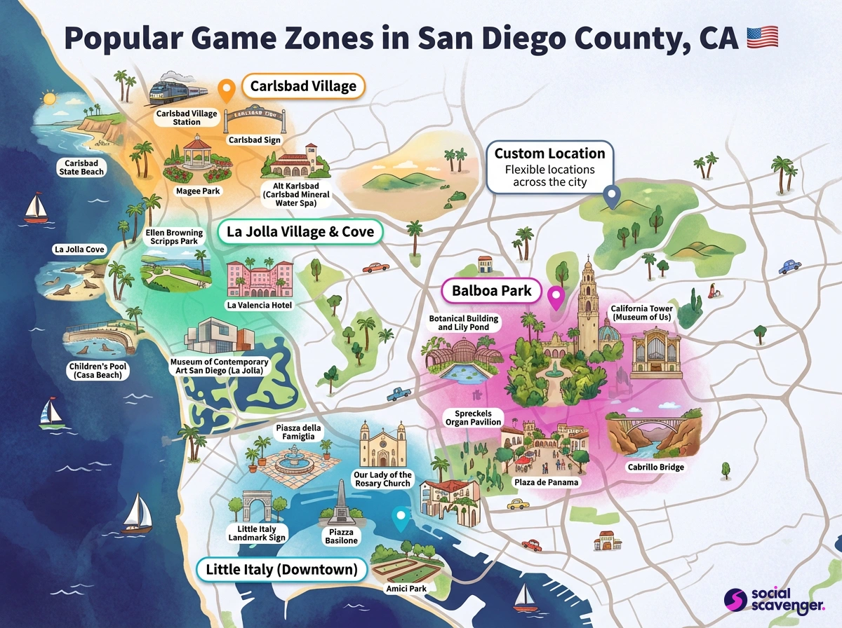 Social Scavenger games in San Diego County can take place in a variety of settings, including popular areas like Balboa Park, the Gaslamp Quarter, or the scenic coastal regions. We can tailor experiences to suit your specific location preferences, whether you want a bustling urban adventure or a more serene seaside challenge.